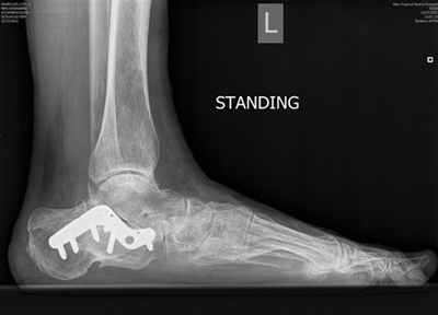 The pre-surgery x-ray from 2012 documents Bill's existing condition when he first visited Dr. Leavitt. It depicts a previous orthopedic surgeon's attempt to fix a calcaneal fracture. The plate was used to keep bone fragments together, but the surgeon was never able to restore the fragments to their correct position, and the plate was "banging" into the ankle bone. Between the arthritis that formed in the wake of surgery, the lack of restored height, and the metal on bone pain, Gagne was in severe pain. I also wish to commend the other doctor involved in Bill's surgery, Dr. Hervey Kimball. One of the essential ingredients in the surgery was the use of a piece of Bill's hip, which did many wonderful things including giving Bill back height, repositioning the heel and fusing the joint thus stopping the pain. Dr. Kimball is a hand surgeon who is often called upon to take pieces of the hip to be used in joint fusions in the foot and hand. He was kind and meticulous and Bill's hip hurt very little after the surgery. -- Dr. Ken Leavitt |