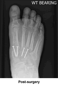 Once I had the cast off I was amazed at how straight my toes (which had been wandering all over the place) were. I can now use my big toe for a ruler if I have to! Ten weeks later and the scars are fading, the discomfort is negligible,